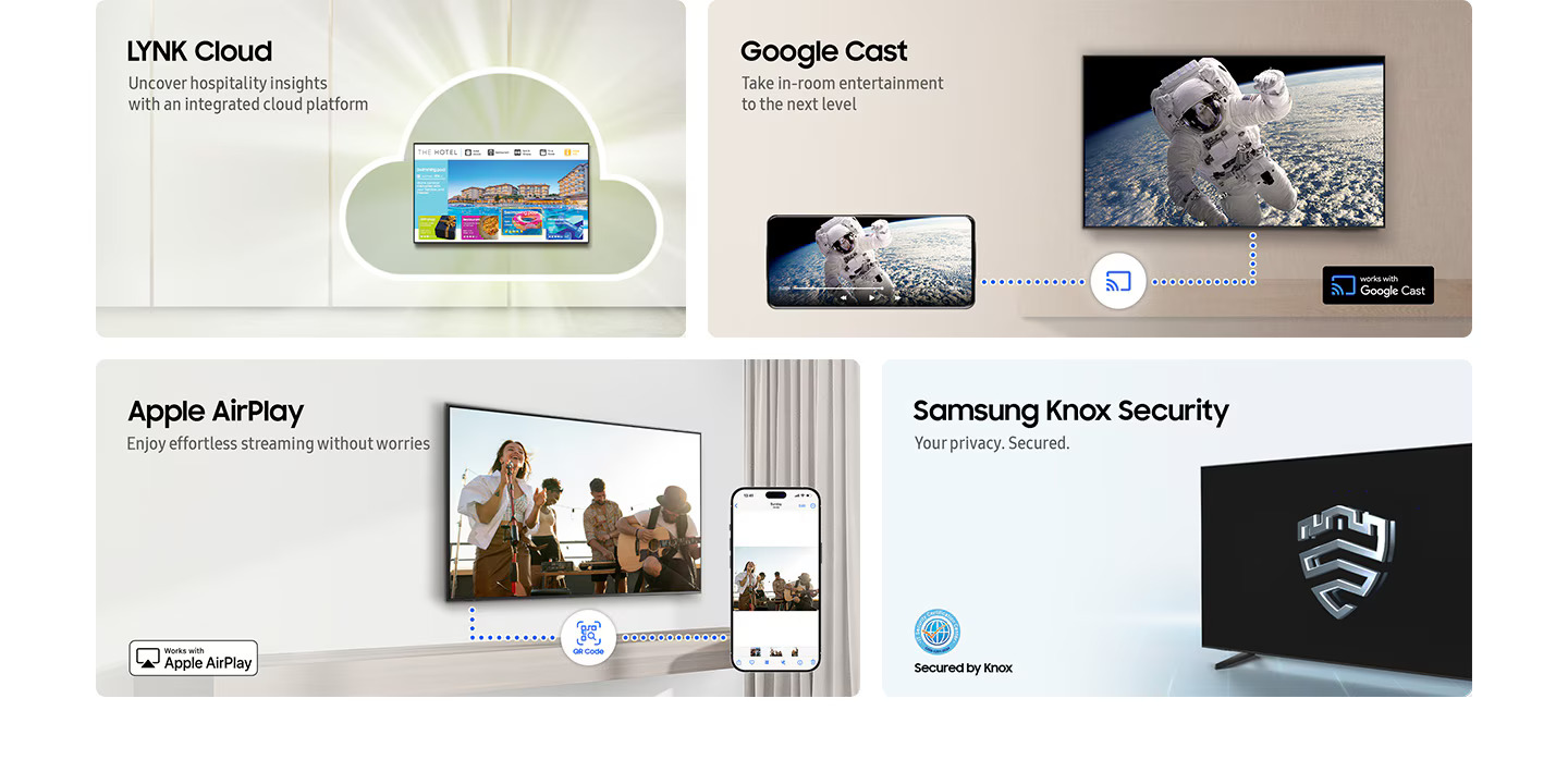 With Google Cast™, guests can cast their favourite content directly from their Android™ and iOS devices to the TV, minimising the need for additional dongles or login requirements. The connection process is quick and straightforward, utilising QR codes for quick pairing.